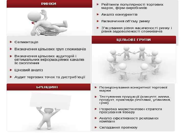 • • • Ви хочете збільшити свою ринкову частку? Ви хочете вивести свою продукцію на нові ринки? Ви хочете збільшити прибуток компанії? Ви хочете вивести новий продукт на ринок? У вас різко впали обсяги продажів, і ви не знаєте в чому причина? • Ви хочете відкрити магазин, салон краси, інший об'єкт і Вам необхідно оцінити привабливість об'єкта з точки зору вкладання інвестицій? • Вам потрібно оцінити найбільш привабливі ринки збуту? • Ви хочете довідатися хто Ваші прямі чи непрямі конкуренти?