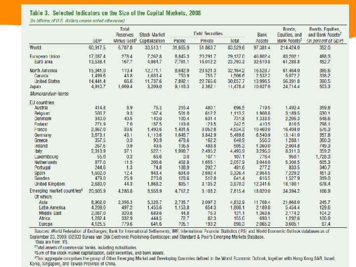Інші розвинені країни КНР Індія Близький і Середній Схід та Африка Інші країни Азії Латинська Америка Країни Центральної та Східної Європи, СНД США Японія Західна Європа Запозичення через кредити, за виключенням цінних паперів 44 106 110 91 127 60 66 54 27 62 Запозичення через випуск цінних паперів, окрім облігацій 77 10 15 29 2 2 2 1 3 2 Запозичення через випуск облігацій нефінансових інституцій 31 18 19 20 10 10 5 10 3 2 Запозичення через випуск облігацій фінансових інституцій 116 31 115 47 16 16 6 7 20 6 Запозичення через випуск державних облігацій 75 220 72 49 28 44 15 34 38 24 Капіталізація фондового ринку 119 72 69 152 97 93 96 62 57 48 Фінансова глибина, % до ВВП 462 457 400 388 280 209 190 168 142