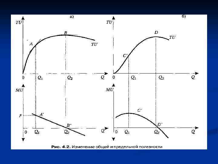 n n n Основные свойства кривых TU и MU сводятся к следующему: • Кривая TU исходит из начала осей координат: при нулевом потреблении общая полезность равна нулю. • При достижении TU своего максимума значение MU равно нулю. • Значения MU отрицательны при снижении TU. • Значение MU достигает максимума в точке перегиба (С) кривой TU на ее возрастающем участке. • Обычно кривая MU имеет отрицательный наклон, однако встречаются случаи, когда некоторая ее часть (на начальной стадии) наклонена положительно (рис. 4. 2, б).