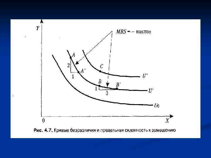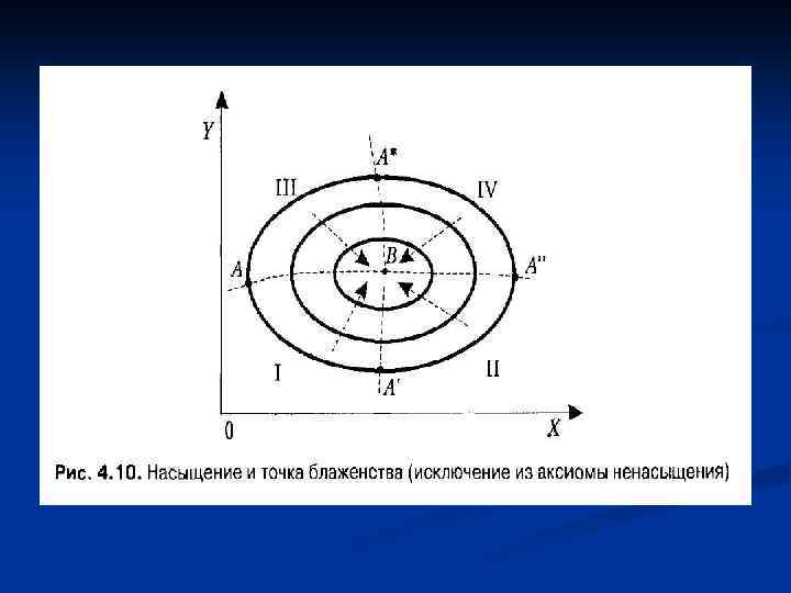 n n Два исключения из аксиомы предпочтения изображены на рис. 4. 10 и 4. 11. Замкнутые кривые безразличия на рис. 4. 10 представляют собой исключение из аксиомы ненасыщения. Так, в точке Л увеличение потребления товара Y (при неизменном X) ухудшает положение потребителя, так как перемещает его на низшую кривую безразличия. Предельная полезность товара Y в данной точке равна нулю и становится величиной отрицательной для большей величины товара Y. Точно так же в точке А' предельная полезность товара X равна нулю и становится отрицательной для большего количества товара X.