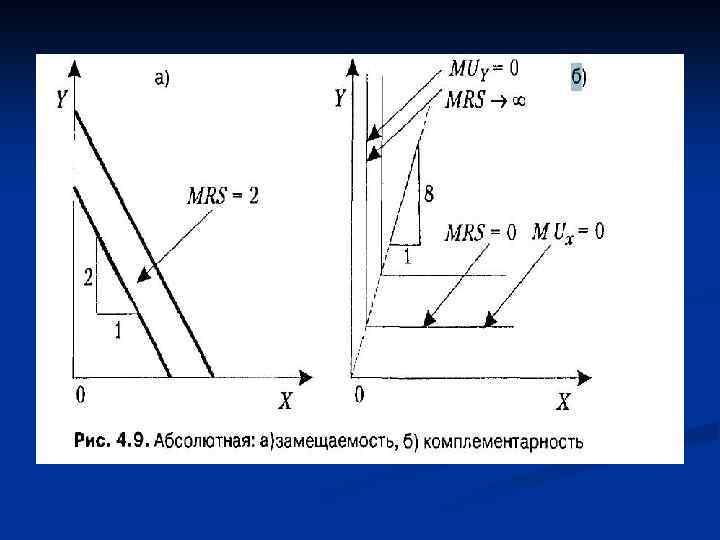 n n n Ограничения и исключения Аксиома выпуклости гласит, что взаимозаменяемость любой пары благ ограничена. Кривые безразличия, изображенные на рис. 4. 9, иллюстрируют крайние случаи. На рис. 4. 9, а линейные кривые безразличия изображают случай абсолютного замещения. товара являются абсолютными Два субститутами, если MRS — величина постоянная. Другой крайний случай изображен на рис. 4. 9, б. Он иллюстрирует абсолютную комплементарность.