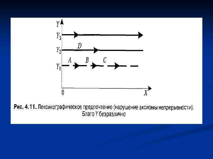 n На рис. 4. 11 изображен случай, который нарушает аксиому непрерывности. В данном случае и X, и Y являются желательными для экономического субъекта, но увеличение X не может компенсироваться уменьшением Y. При потреблении данной величины Y большая величина X предпочитается меньшей, что проиллюстрировано соответствующими стрелками (С предпочтительней В, В предпочтительней A и т. д. ). Тем не менее любая точка, лежащая на более высокой горизонтальной линии (например D), предпочтительней каждой из точек на более низкой линии (А, В, С и т. д. ). Таким образом, в данном случае кривых безразличия попрос не существует, ибо не существует ни одной пары благ с один полезностью.