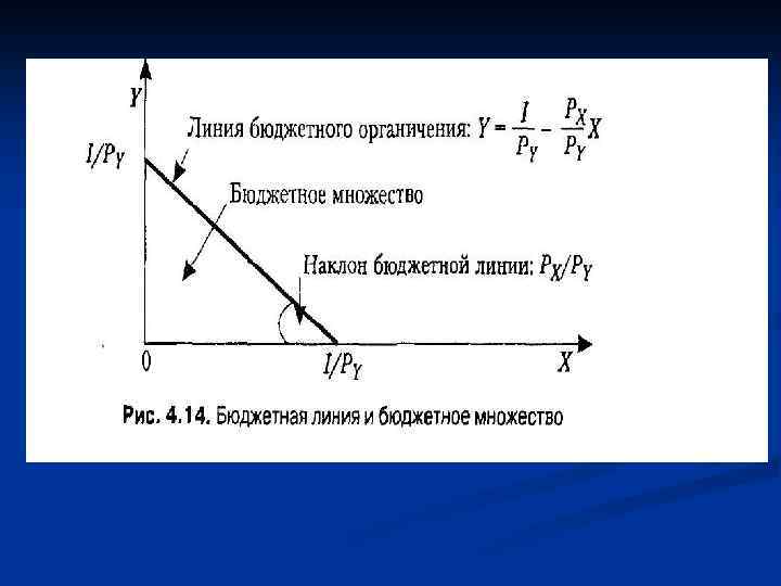 3. Бюджетное ограничение n n Экономический субъект в своей деятельности стремится достичь максимальной полезности. Однако его возможности, как правило, далеко не безграничны, т. е. способность субъекта удовлетворять свои предпочтения определяются при помощи бюджетного ограничения. Бюджет индивида определяется доходом (I). Если предположить, что доход экономического субъекта расходуется на приобретение только двух товаров (X u У) по соответствующим ценам Pх и Рy то бюджетное ограничение можно выразить следующим образом: