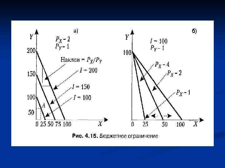 n n Рассмотрим бюджетное ограничение (рис. 4. 15) со следующими параметрами: I = 100 р. , Рх =2 p. , PY = 1 р. Наклон линии бюджетного ограничения равен -2 (-Рх/ Ру). Это означает, что 2 ед. товара Y стоят 1 ед. товара X. Все точки, лежащие ниже линии бюджетного ограничения или на самой линии, достижимы и составляют множество так называемого достижимого набора благ. Любая же точка, лежащая выше линии бюджетного ограничения, недостижима. При изменении цен и доходов соответственно изменяется и достижимый набор. В частности, рост дохода со 100 до 150 р. увеличивает достижимый набор. Так как цены не изменились, наклон линии остался прежним (рис. 4. 15, а). Изменение цены на один из товаров меняет наклон линии бюджетного ограничения. На рис. 4. 15, б показаны последствия изменения цены Рх: если товар X подешевел в 2 раза, линия бюджетного ограничения сдвинулась влево, а если упомянутый товар подорожал в 2 раза — то соответственно вправо.