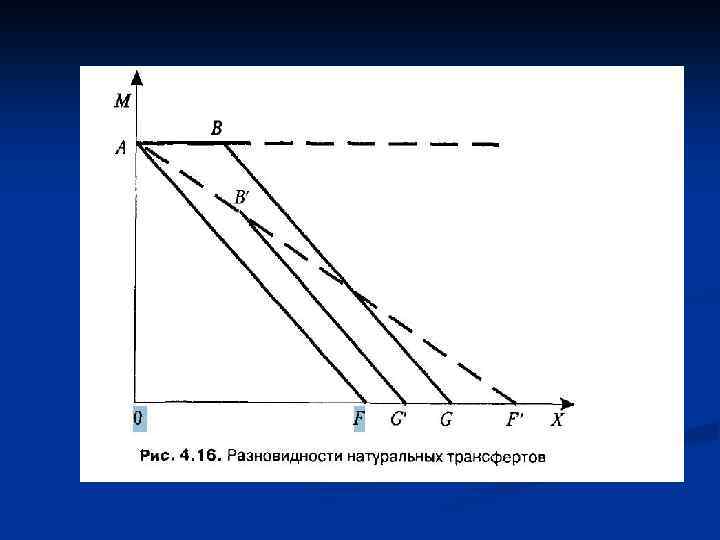 n Ломаные линии бюджетных ограничений n n n Бюджетные ограничения, которые мы рассматривали до сих пор, имели вид прямых линий. Однако они могут быть представлены и ломаными линиями. Такие ситуации возникают при трансфертах, субсидиях, скидках и налогах. 1. Натуральные трансферты. Воздействие натуральных (неденежных) трансфертов изображено на рис. 4. 16. Предположим, что в данном случае мы имеем дело с пищей (товар X по оси абсцисс) и деньгами (товар М по оси ординат). В отсутствие субсидий или натуральных трансфертов бюджетное ограничение принимает положение AF, где ОА представляет собой денежный доход. Если ОА тратится на все прочие товары, кроме X, то потребление пищи равно нулю. Однако если экономический субъект получает определенное количество трансфертов (АВ), например в виде бесплатных талонов на еду, то деньги ОА могут быть потрачены на любые товары, а количество потребленной пищи составит величину АВ. Бюджетная линия сдвигается параллельно вправо: граница производственных возможностей приобретает вид ABG вместо AF.