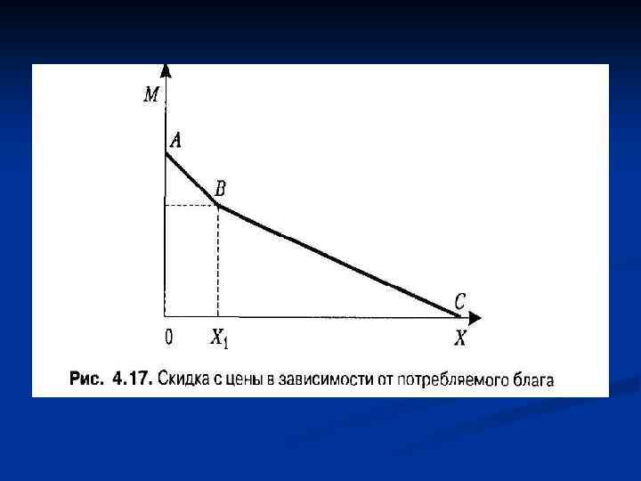n 2. Денежные трансферты. Этот вид трансферта можно рассмотреть на примере оплаты за электроэнергию. Допустим, определенное количество потребляемой энергии (Xj) потребитель оплачивает по обычному тарифу, а сверх того — по пониженному. Данная практика называется скидкой с цены и графически изображена на рис. 4. 17. Линия бюджетного ограничения в данном случае примет вид АBC.