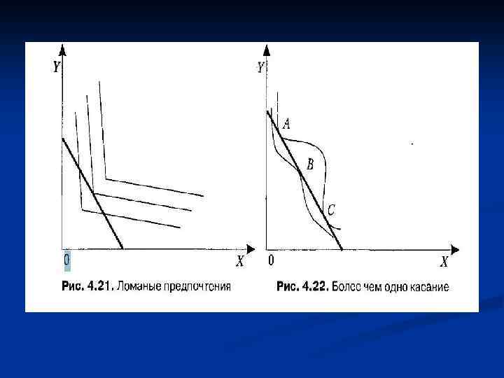 n Равенство MRS = Рх/Ру не выполняется и в том случае, когда кривые безразличия представляют собой ломаные линии (рис. 4. 21). В данном случае касательная просто неопределима. На рис. 4. 22 приведен еще один исключительный случай, иллюстрирующий три точки касания (A, В, С). Однако только точки A и С демонстрируют при этом оптимальный выбор наборов: точка В находится на вогнутой к началу координат линии безразличия.