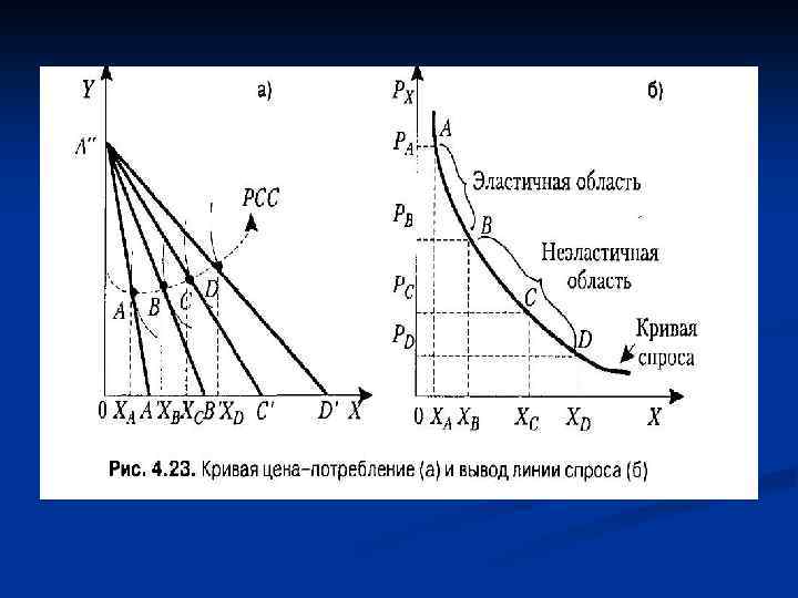 n n Кривая цена-потребление (РСС) и построение кривой спроса На рис. 4. 23, а изображены оптимумы потребления для 4 линий бюджетных ограничений. Денежный доход I и цена товара Y принимаются постоянными величинами, а изменяется только Рх. При уменьшении цены товара X точка пересечения линий бюджетного ограничения и кривых безразличия перемещается от A к D; потребитель меняет свой оптимальный выбор, двигаясь от A к В, далее к С и к D. Линия, полученная в результате этого, называется кривой цена-потребление (РСС — price consumption curve).