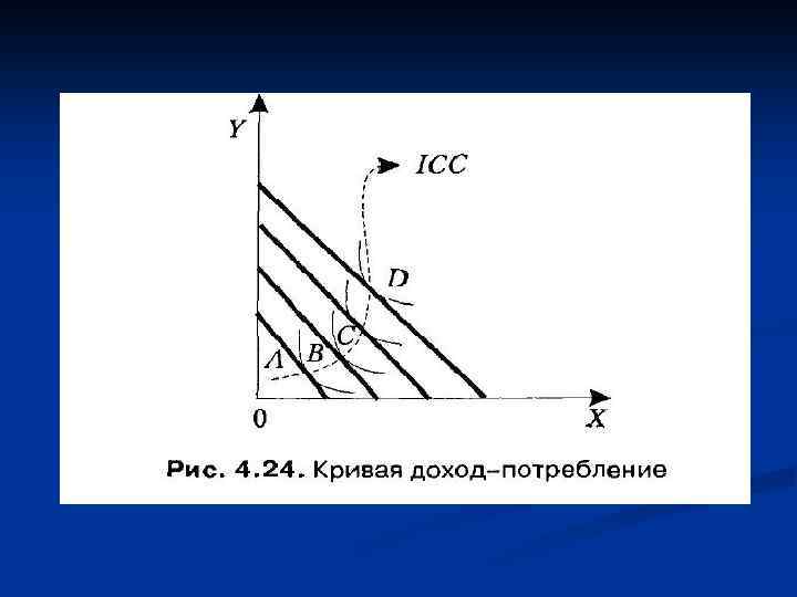 Кривая доход-потребление (ICC) и построение кривой Энгеля Рисунок 4. 24 иллюстрирует влияние изменения дохода на потребление. Точки касания кривых безразличия и множества параллельных линий бюджетного ограничения (А, В, С и т. д. ) образуют так называемую кривую потребление-доход (ICC — income consumption curve). Кривая потребление-доход (ICC)— это линия, иллюстрирующая изменение оптимального индивидуального потребления двух товаров при движении величины дохода и постоянных ценах Если кривая цена-потребление (РСС) служит основой для построения кривых спроса, то кривая ICC может быть использована для получения кривой Энгеля, которая представляет эффект изменения дохода в зависимости от количества закупаемого блага. n n