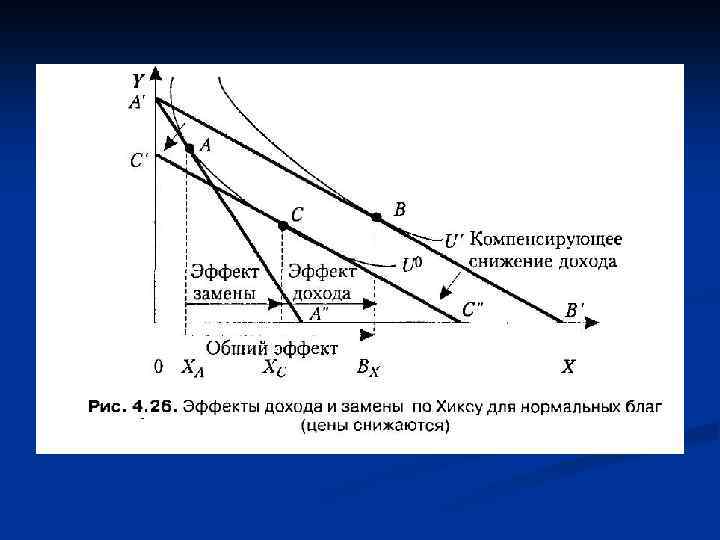 n n На рис. 4. 24 товар X является «нормальным» до величины дохода, ограниченного точкой С, но становится «некачественным» при более высоких уровнях дохода. Отсюда следует, что, во-первых, малых при изменениях дохода любой товар может быть «некачественным» или «нормальным» в зависимости от индивидуальных предпочтений и природы товара. Во-вторых, само понятие «нормальности» или «некачественности» относится скорее к индивидуальным предпочтениям потребителей, нежели к самим товарам.