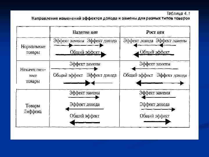 4. Эффект дохода и эффект замены Эффекты дохода и замены нормального товара. Изменение цены товара влияет на объем спроса покупателя через механизм двух эффектов: эффекта замены и эффекта дохода. n В микроэкономической теории существуют два подхода для выделения эффекта дохода и эффекта замены: в соответствии с теорией Дж. Хикса и Е. Е. Слуцкого. Существование этих подходов объясняется спецификой интерпретации реального дохода этими двумя экономистами. n