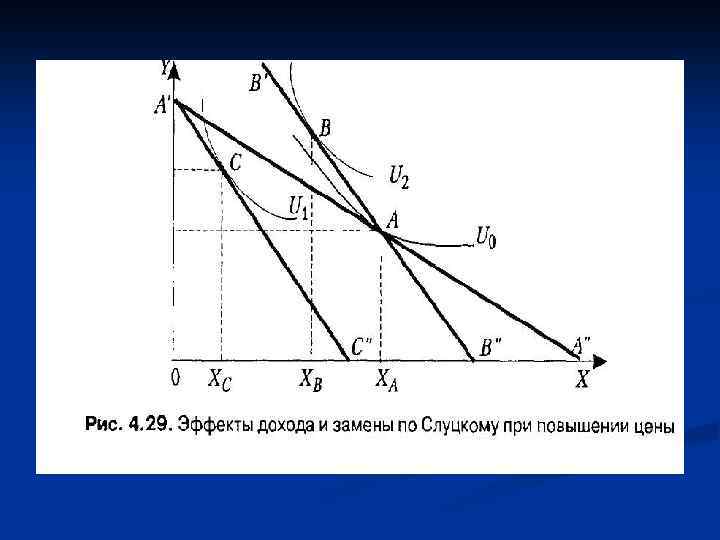 n Как и в подходе Хикса, повышение цены на товар X приводит к смещению бюджетного ограничения из положения А'А" в положение А'С. Однако на этом сходство заканчивается. Далее в подходе Хикса для восстановления первоначального дохода необходимо было провести новую бюджетную линию В'В", параллельную бюджетной линии А'С, до пересечения с прежней кривой безразличия U 0. Сейчас же бюджетная линия В'В" проводится через прежнюю точку А, к ней строится новая кривая безразличия U 2 и так находится точка В. Кривая безразличия U 2 выше кривой безразличия U 0. В данном случае эффект замены равен ХА - Хв, а эффект дохода — Хв— Хс.