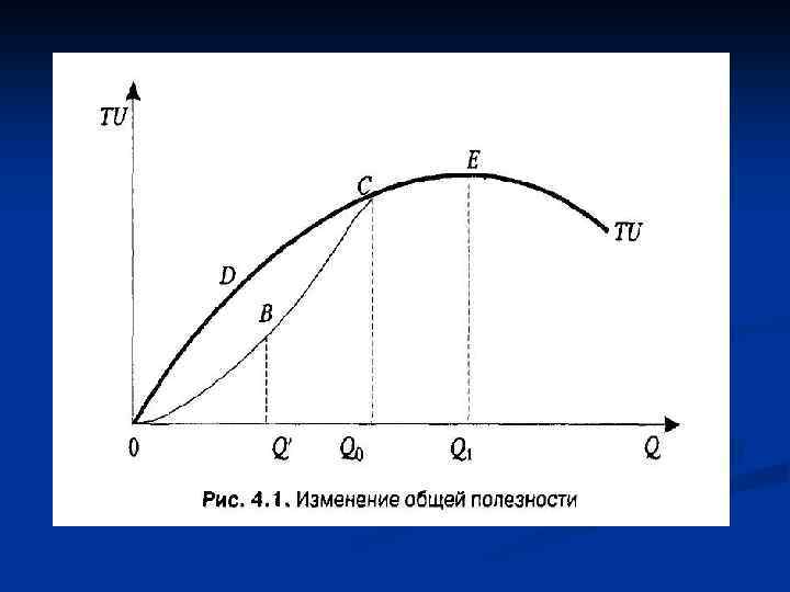 n Общее удовлетворение от всех единиц (наборов) потребляемых благ в данный период времени называется общей полезностью (TU — total utility). Функцию полезности можно выразить следующим образом: n TU = f(Qa, Qb…Qz) (4. 1) n Где Qa, Qb…Qz — объемы потребления товаров А, В, . . . Z в единицу времени.