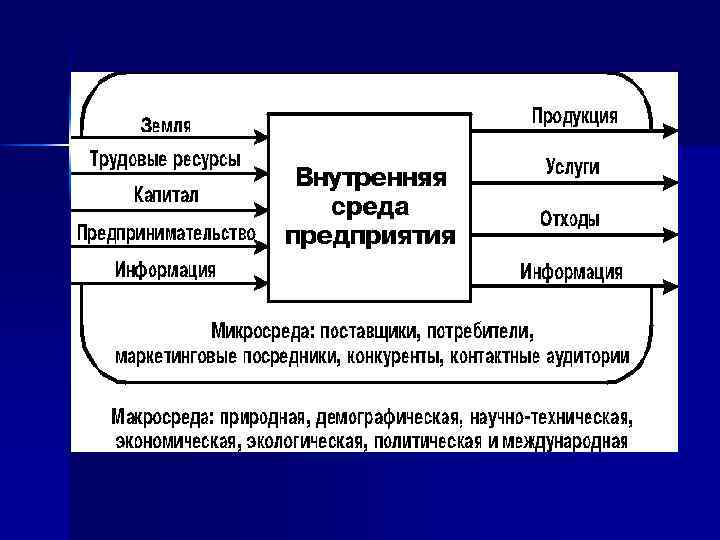 n n Любое предприятие, как открытая операционная система, взаимодействует с внешней средой, приспосабливая свою внутреннюю структуру к её изменениям. Всё, что может изменить предприятие, что зависит от принимаемых решений, что управляемо, принято называть управляемыми переменными (эндогенными факторами).