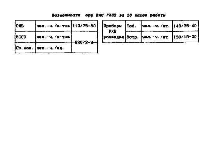 Ремонтные подразделения отдельного ремонтновосстановительного батальона Ви. С РХБЗ ФРВБ Рота специализированного ремонта (рср) Командир роты Зам. командира роты по воспитательной работе Старший техник 1 1 - 74 в/вс. Старшина 1 Ремонтные взводы машин и комплектов СО средств защиты 22 24 20 Ремонтные отделения 10 10 11 10 приборов разведки 9 10 ПРХМ-10 – 1: Машина № 1 – 1 Машина № 2 – 1 Машина № 3 – 1 Машина № 4 – 1 Прицеп № 1 – 1 Прицеп № 2 – 1 Машина № 5 – 1 Машина № 6 – 1 Машина № 7 – 1 Машина № 8 – 1 Прицеп № 1 – 1 Прицеп № 2 – 1 Прицеп № 3 – 2 Машина № 9 – 1 Машина № 10 – 1 Телефонист 1 Отделение энергетического обеспечения 4 Электростанция силовая 10 -20 к. Вт – 2 шт.