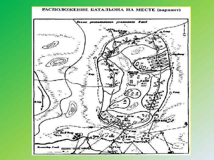 Учебный вопрос -№ 1. «Расположение мотострелковых ( танк) подразделений на местности. Организации инженерных работ и маскировки в ходе размещении подразделений на местности » . Расположение подразделений в исходных районах, районе ожидания, районе отдыха и других районах принято называть расположением на месте. Район расположения назначачется обычно на местности, имеющей естественные укрытия и обеспечивающей защиту подразделении от оружия массового поражения и высокоточного оружия. Он должен обеспечивать рассредоточенное и скрытное их размещение, быстрый сбор и проведение маневра в нужном направлении, удобство размеще ния и отдыха личного состава, а также благоприятные условия в санитарно эпидемическом отношении. Следует избегать расположения подразделений вблизи важных объектов, населенных пунктов, по которым противник может нанести массированные огневые и ядерные удары. Расположение подразделений в населенных пунктах обычно осуществляется в условиях суровой зимы или длительной непогоды, если нет времени на устройство укрытий вне населенных пунктов, или при наличии населенных пунктов, освобожденных от местных жителей.