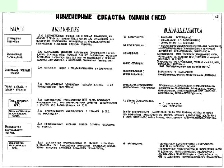 Инженерно-технические средства охраны предназначаются для: • • • • - выдачи сигналов караулам о попытках проникновения нарушителей на охраняемый объект (с объекта) через запретную зону, - затруднения действий нарушителей при попытках их проникновения на объект (с объекта), в режимное помещение (здание, сооружение) и к специальным грузам; - определения времени и места нарушения запретной зоны и направления движения нарушителя - создания караулам благоприятных условий по выполнению служебно-боевых задач минимальными силами; - непрерывного управления часовыми и караулами и своевременного получения от них оперативной информации; - дистанционного наблюдения за действиями нарушителей и часовых (тревожных групп), состоянием запретных зон, КПП и режимных помещений; - обеспечения маневра силами и средствами при несении службы караулами; - обозначения границ и участков запретных зон, постов охраны; - регистрации (документирования) сигналов от средств обнаружения, распоряжений и команд, отдаваемых должностными лицами караула, докладов часовых (тревожных групп); - обеспечения установленного режима пропуска людей и транспорта на объект (с объекта) в режимные помещения и здания и создания необходимых условий часовым при несении службы на КПП и постах с пропускными функциями; - обеспечения выявления запрещенных для проноса (провоза) через КПП предметов, - обнаружения нарушителей, укрывшихся в транспортных средствах или грузах с целью несанкционированного проникновения на объект (с объекта) через КПП; - обеспечения необходимых условий для применения в охране объектов служебных собак.