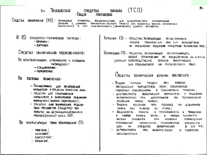 К техническим средствам охраны (ТСО) относятся: • • • • - средства обнаружения (СО) нарушителей; - средства обнаружения проноса (провоза) запрещенных предметов, материалов и веществ; - средства управления доступом на объект (СУД); - средства идентификации и учета лиц; - средства автоматического контроля (тестирования) персонала объекта и сил охраны; - средства сбора и обработки информации (ССОИ) от средств обнаружения и средств управления доступом на объект; - средства постовой телефонной (радио) связи; - средства тревожно-вызывной сигнализации; - средства наблюдения; - средства контроля состояния часовых; - средства защиты и документирования информации о функционировании автоматизированной системы охраны объекта или автоматизированной системы обеспечения безопасности перевозки специальных грузов; - устройства управления физическими барьерами и средствами воздействия; - вспомогательные средства (система электропитания ТСО, охранное электроосвещение, кабельные сети и коммуникации, нестандартизованное оборудование и др. ).