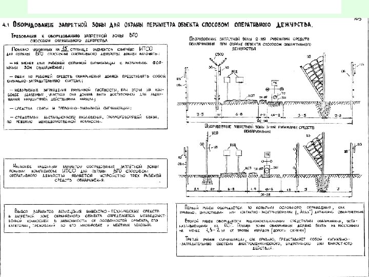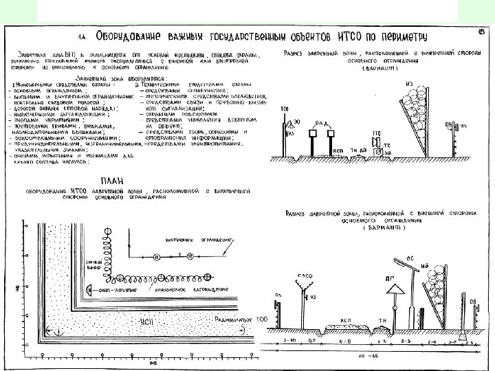 Требования к оборудованию объекта элементами КТСО • 1. Периметр защищённой зоны должен быть оборудован: • не менее чем двумя рубежами технических средств обнаружения, работающих на разных физических принципах; • средствами оптико-электронного наблюдения; • средствами проводной связи; • обеспечивающими системами. • 2. Внутренняя, локальная и особо важная зоны должны быть оборудованы: • рубежом технических средств обнаружения; • средствами оптико-электронного наблюдения; • средствами управления доступом; • средствами обнаружения проноса ядерных материалов, металлов и взрывчатых веществ; • системой проводной связи; • обеспечивающими системами.