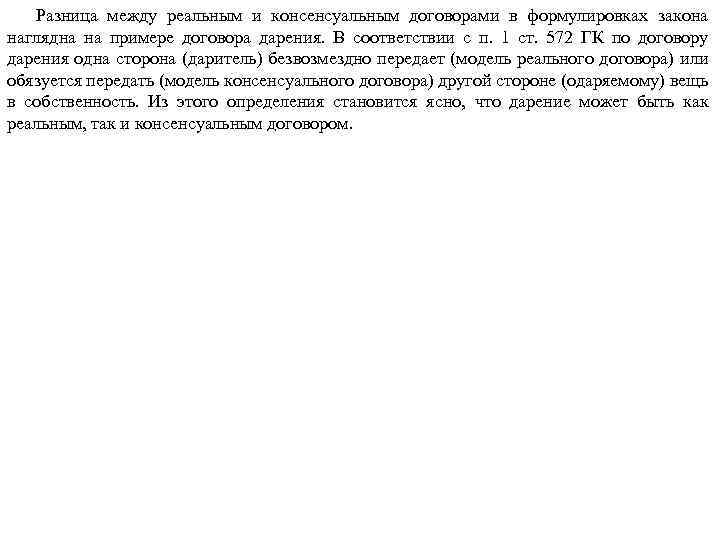 Разница между реальным и консенсуальным договорами в формулировках закона наглядна на примере договора дарения. В соответствии с п. 1 ст. 572 ГК по договору дарения одна сторона (даритель) безвозмездно передает (модель реального договора) или обязуется передать (модель консенсуального договора) другой стороне (одаряемому) вещь в собственность. Из этого определения становится ясно, что дарение может быть как реальным, так и консенсуальным договором.