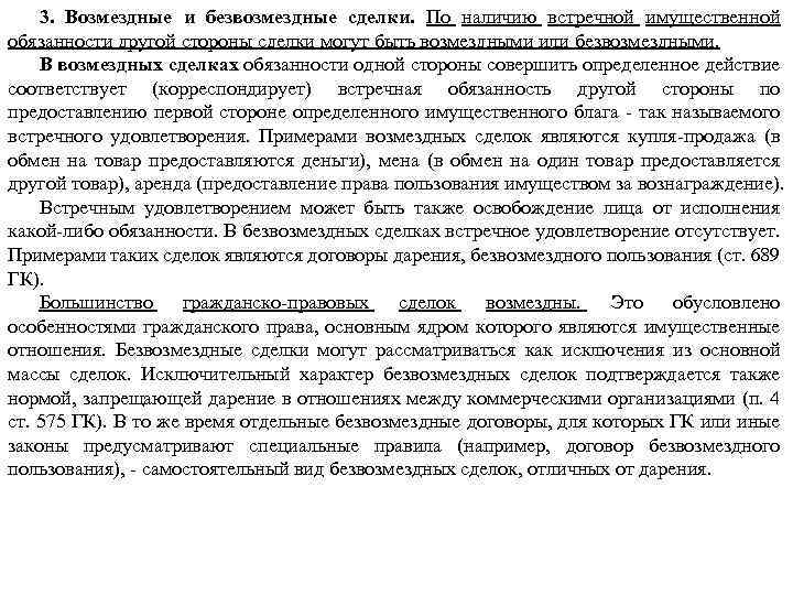 3. Возмездные и безвозмездные сделки. По наличию встречной имущественной обязанности другой стороны сделки могут быть возмездными или безвозмездными. В возмездных сделках обязанности одной стороны совершить определенное действие соответствует (корреспондирует) встречная обязанность другой стороны по предоставлению первой стороне определенного имущественного блага - так называемого встречного удовлетворения. Примерами возмездных сделок являются купля-продажа (в обмен на товар предоставляются деньги), мена (в обмен на один товар предоставляется другой товар), аренда (предоставление права пользования имуществом за вознаграждение). Встречным удовлетворением может быть также освобождение лица от исполнения какой-либо обязанности. В безвозмездных сделках встречное удовлетворение отсутствует. Примерами таких сделок являются договоры дарения, безвозмездного пользования (ст. 689 ГК). Большинство гражданско-правовых сделок возмездны. Это обусловлено особенностями гражданского права, основным ядром которого являются имущественные отношения. Безвозмездные сделки могут рассматриваться как исключения из основной массы сделок. Исключительный характер безвозмездных сделок подтверждается также нормой, запрещающей дарение в отношениях между коммерческими организациями (п. 4 ст. 575 ГК). В то же время отдельные безвозмездные договоры, для которых ГК или иные законы предусматривают специальные правила (например, договор безвозмездного пользования), - самостоятельный вид безвозмездных сделок, отличных от дарения.