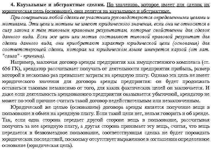 4. Каузальные и абстрактные сделки. По значению, которое имеет для сделок их юридическая цель (основание), они делятся на каузальные и абстрактные. При совершении любой сделки ее участники руководствуются определенными целями и мотивами. Эти цели и мотивы не имеют юридического значения, если они не относятся в силу закона к тем типовым правовым результатам, которые свойственны для сделок данного вида. Если же цель или мотив составляют типовой правовой результат для сделки данного вида, они приобретают характер юридической цели (основания) для соответствующей сделки, которая на юридическом языке именуется каузой (от лат. "causa" - причина). Например, заключая договор аренды предприятия как имущественного комплекса (ст. 656 ГК), арендатор рассчитывает получать от деятельности предприятия прибыль, размер которой в несколько раз превышает затраты на арендную плату. Однако эта цель не имеет юридического значения для договора аренды предприятия: он будет продолжать оставаться таковым независимо от того, для каких фактических целей он заключается. И даже если деятельность арендованного предприятия оказывается убыточной, арендатор не может по этой причине считать такой договор недействительным или незаключенным. Юридической же целью (основанием) договора аренды является получение вещи в пользование в обмен на арендную плату. Если такой цели нет, нельзя говорить и об аренде. Так, если одна сторона передает другой стороне вещь в пользование, рассчитывая получить за нее арендную плату, а другая сторона принимает эту вещь, считая, что вещь передается в безвозмездное пользование, соответствующая сделка не будет порождать юридических последствий, поскольку отсутствует выраженное в соглашении определенное основание (юридическая цель).