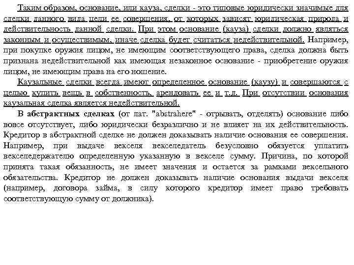 Таким образом, основание, или кауза, сделки - это типовые юридически значимые для сделки данного вида цели ее совершения, от которых зависят юридическая природа и действительность данной сделки. При этом основание (кауза) сделки должно являться законным и осуществимым, иначе сделка будет считаться недействительной. Например, при покупке оружия лицом, не имеющим соответствующего права, сделка должна быть признана недействительной как имеющая незаконное основание - приобретение оружия лицом, не имеющим права на его ношение. Каузальные сделки всегда имеют определенное основание (каузу) и совершаются с целью купить вещь в собственность, арендовать ее и т. д. При отсутствии основания каузальная сделка является недействительной. В абстрактных сделках (от лат. "abstrahere" - отрывать, отделять) основание либо вовсе отсутствует, либо юридически безразлично и не влияет на их действительность. Кредитор в абстрактной сделке не должен доказывать наличие основания ее совершения. Например, при выдаче векселя векселедатель безусловно обязуется уплатить векселедержателю определенную указанную в векселе сумму. Причина, по которой принята такая обязанность, не имеет значения и остается за рамками вексельного обязательства. Кредитор не должен доказывать наличие основания выдачи векселя (например, договора займа, в силу которого кредитор имеет право требовать соответствующую сумму от должника).