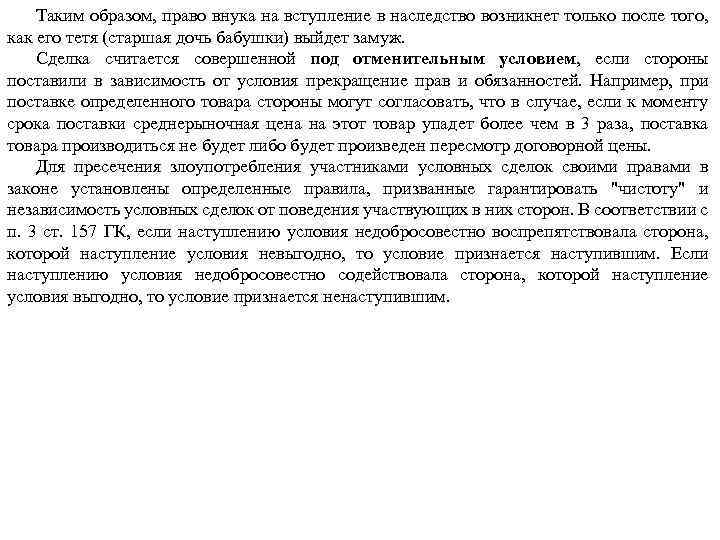Таким образом, право внука на вступление в наследство возникнет только после того, как его тетя (старшая дочь бабушки) выйдет замуж. Сделка считается совершенной под отменительным условием, если стороны поставили в зависимость от условия прекращение прав и обязанностей. Например, при поставке определенного товара стороны могут согласовать, что в случае, если к моменту срока поставки среднерыночная цена на этот товар упадет более чем в 3 раза, поставка товара производиться не будет либо будет произведен пересмотр договорной цены. Для пресечения злоупотребления участниками условных сделок своими правами в законе установлены определенные правила, призванные гарантировать "чистоту" и независимость условных сделок от поведения участвующих в них сторон. В соответствии с п. 3 ст. 157 ГК, если наступлению условия недобросовестно воспрепятствовала сторона, которой наступление условия невыгодно, то условие признается наступившим. Если наступлению условия недобросовестно содействовала сторона, которой наступление условия выгодно, то условие признается ненаступившим.