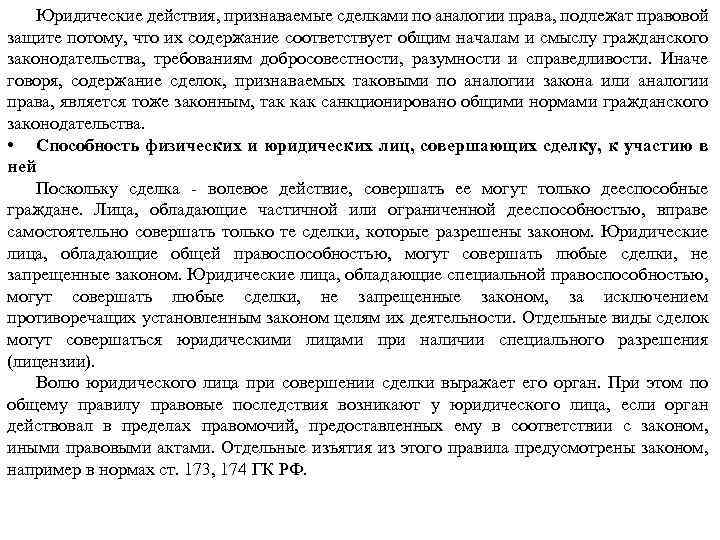 Юридические действия, признаваемые сделками по аналогии права, подлежат правовой защите потому, что их содержание соответствует общим началам и смыслу гражданского законодательства, требованиям добросовестности, разумности и справедливости. Иначе говоря, содержание сделок, признаваемых таковыми по аналогии закона или аналогии права, является тоже законным, так как санкционировано общими нормами гражданского законодательства. • Способность физических и юридических лиц, совершающих сделку, к участию в ней Поскольку сделка - волевое действие, совершать ее могут только дееспособные граждане. Лица, обладающие частичной или ограниченной дееспособностью, вправе самостоятельно совершать только те сделки, которые разрешены законом. Юридические лица, обладающие общей правоспособностью, могут совершать любые сделки, не запрещенные законом. Юридические лица, обладающие специальной правоспособностью, могут совершать любые сделки, не запрещенные законом, за исключением противоречащих установленным законом целям их деятельности. Отдельные виды сделок могут совершаться юридическими лицами при наличии специального разрешения (лицензии). Волю юридического лица при совершении сделки выражает его орган. При этом по общему правилу правовые последствия возникают у юридического лица, если орган действовал в пределах правомочий, предоставленных ему в соответствии с законом, иными правовыми актами. Отдельные изъятия из этого правила предусмотрены законом, например в нормах ст. 173, 174 ГК РФ.