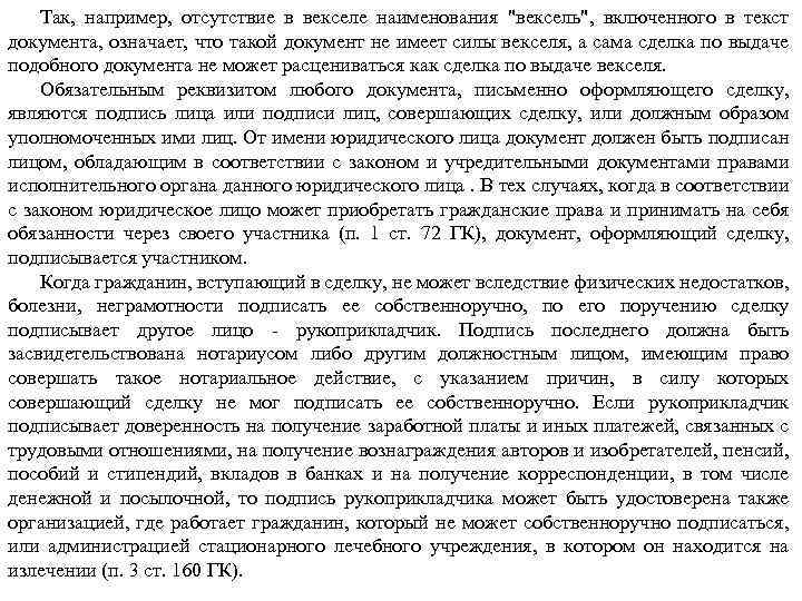 Так, например, отсутствие в векселе наименования "вексель", включенного в текст документа, означает, что такой документ не имеет силы векселя, а сама сделка по выдаче подобного документа не может расцениваться как сделка по выдаче векселя. Обязательным реквизитом любого документа, письменно оформляющего сделку, являются подпись лица или подписи лиц, совершающих сделку, или должным образом уполномоченных ими лиц. От имени юридического лица документ должен быть подписан лицом, обладающим в соответствии с законом и учредительными документами правами исполнительного органа данного юридического лица. В тех случаях, когда в соответствии с законом юридическое лицо может приобретать гражданские права и принимать на себя обязанности через своего участника (п. 1 ст. 72 ГК), документ, оформляющий сделку, подписывается участником. Когда гражданин, вступающий в сделку, не может вследствие физических недостатков, болезни, неграмотности подписать ее собственноручно, по его поручению сделку подписывает другое лицо - рукоприкладчик. Подпись последнего должна быть засвидетельствована нотариусом либо другим должностным лицом, имеющим право совершать такое нотариальное действие, с указанием причин, в силу которых совершающий сделку не мог подписать ее собственноручно. Если рукоприкладчик подписывает доверенность на получение заработной платы и иных платежей, связанных с трудовыми отношениями, на получение вознаграждения авторов и изобретателей, пенсий, пособий и стипендий, вкладов в банках и на получение корреспонденции, в том числе денежной и посылочной, то подпись рукоприкладчика может быть удостоверена также организацией, где работает гражданин, который не может собственноручно подписаться, или администрацией стационарного лечебного учреждения, в котором он находится на излечении (п. 3 ст. 160 ГК).