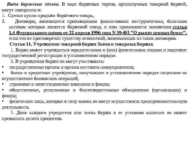 Виды биржевых сделок. В ходе биржевых торгов, организуемых товарной биржей, могут совершаться: 1. Сделки купли-продажи биржевого товара, 2. Договоры, являющиеся производными финансовыми инструментами, базисным активом которых является биржевой товар, к ним применяются положения статьи 1. 4 Федерального закона от 22 апреля 1996 года N 39 -ФЗ "О рынке ценных бумаг", если это не противоречит существу отношений, возникающих из таких договоров. Статья 11. Учреждение товарной биржи Закон о товарных биржах 1. Биржа может учреждаться юридическими и (или) физическими лицами и подлежит государственной регистрации в установленном порядке. 2. В учреждении биржи не могут участвовать: • государственные органы и органы местного самоуправления; • банки и кредитные учреждения, получившие в установленном порядке лицензию на осуществление банковских операций; • страховые и инвестиционные компании и фонды; • общественные, религиозные и благотворительные объединения (организации) и фонды; • физические лица, которые в силу закона не могут осуществлять предпринимательскую деятельность. 3. Доля каждого учредителя или члена биржи в ее уставном капитале не может превышать десяти процентов.