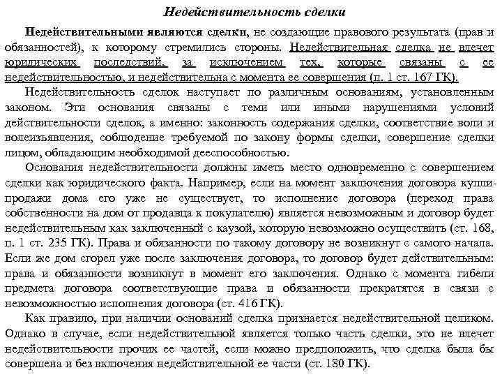 Недействительность сделки Недействительными являются сделки, не создающие правового результата (прав и обязанностей), к которому стремились стороны. Недействительная сделка не влечет юридических последствий, за исключением тех, которые связаны с ее недействительностью, и недействительна с момента ее совершения (п. 1 ст. 167 ГК). Недействительность сделок наступает по различным основаниям, установленным законом. Эти основания связаны с теми или иными нарушениями условий действительности сделок, а именно: законность содержания сделки, соответствие воли и волеизъявления, соблюдение требуемой по закону формы сделки, совершение сделки лицом, обладающим необходимой дееспособностью. Основания недействительности должны иметь место одновременно с совершением сделки как юридического факта. Например, если на момент заключения договора куплипродажи дома его уже не существует, то исполнение договора (переход права собственности на дом от продавца к покупателю) является невозможным и договор будет недействительным как заключенный с каузой, которую невозможно осуществить (ст. 168, п. 1 ст. 235 ГК). Права и обязанности по такому договору не возникнут с самого начала. Если же дом сгорел уже после заключения договора, то договор будет действительным: права и обязанности возникнут в момент его заключения. Однако с момента гибели предмета договора соответствующие права и обязанности прекратятся в связи с невозможностью исполнения договора (ст. 416 ГК). Как правило, при наличии оснований сделка признается недействительной целиком. Однако в случае, если недействительной является только часть сделки, это не влечет недействительности прочих ее частей, если можно предположить, что сделка была бы совершена и без включения недействительной ее части (ст. 180 ГК).