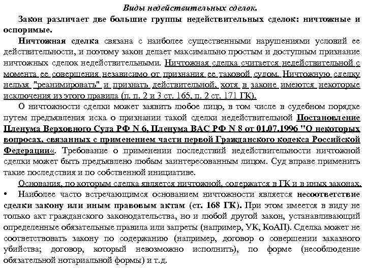 Виды недействительных сделок. Закон различает две большие группы недействительных сделок: ничтожные и оспоримые. Ничтожная сделка связана с наиболее существенными нарушениями условий ее действительности, и поэтому закон делает максимально простым и доступным признание ничтожных сделок недействительными. Ничтожная сделка считается недействительной с момента ее совершения независимо от признания ее таковой судом. Ничтожную сделку нельзя "реанимировать" и признать действительной, хотя в законе имеются некоторые исключения из этого правила (п. п. 2 и 3 ст. 165, п. 2 ст. 171 ГК). О ничтожности сделки может заявить любое лицо, в том числе в судебном порядке путем предъявления иска о признании такой сделки недействительной Постановление Пленума Верховного Суда РФ N 6, Пленума ВАС РФ N 8 от 01. 07. 1996 "О некоторых вопросах, связанных с применением части первой Гражданского кодекса Российской Федерации «. Требование о применении последствий недействительности ничтожной сделки может быть предъявлено любым заинтересованным лицом. Суд вправе применить такие последствия и по собственной инициативе. Основания, по которым сделка является ничтожной, содержатся в ГК и в иных законах. • Наиболее часто встречающимся основанием ничтожности является несоответствие сделки закону или иным правовым актам (ст. 168 ГК). При этом имеется в виду не только акт гражданского законодательства, но и любой другой закон, устанавливающий определенные обязательные правила или запреты (например, УК, Ко. АП). Сделка может не соответствовать закону по содержанию (например, договор о совершении заказного убийства; договор, который невозможно исполнить), по форме (несоблюдение обязательной нотариальной формы) и т. д.