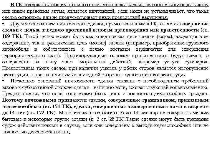 В ГК содержится общее правило о том, что любая сделка, не соответствующая закону или иным правовым актам, является ничтожной, если закон не устанавливает, что такая сделка оспорима, или не предусматривает иных последствий нарушения. • Другим основанием ничтожности сделки, прямо названным в ГК, является совершение сделки с целью, заведомо противной основам правопорядка или нравственности (ст. 169 ГК). Такой целью может быть как юридическая цель сделки (кауза), входящая в ее содержание, так и фактическая цель (мотив) сделки (например, приобретение грузового автомобиля в собственность с целью доставки взрывчатки для совершения террористического акта). Противоречащими основам нравственности будут сделки о совершении за плату явно аморальных действий, например услуги сутенеров. Последствием таких сделок при наличии умысла у обеих сторон является недопущение реституции, а при наличии умысла у одной стороны - односторонняя реституция • Несколько оснований ничтожности сделки связаны с несоблюдением требований закона к субъективной стороне сделки - наличию воли, соответствующей волеизъявлению. Предполагается, что такая воля может быть лишь у полностью дееспособных граждан. Поэтому ничтожными признаются сделки, совершенные гражданином, признанным недееспособным (ст. 171 ГК), сделки, совершенные несовершеннолетними в возрасте до 14 лет (ст. 172 ГК). Малолетние в возрасте от 6 до 14 лет вправе совершать мелкие бытовые и некоторые другие сделки (п. 2 ст. 28 ГК). Такие сделки могут быть признаны судом действительными в случае, если они совершены к выгоде недееспособных или не полностью дееспособных лиц.