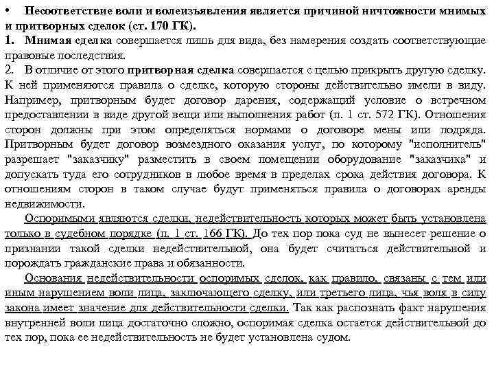 • Несоответствие воли и волеизъявления является причиной ничтожности мнимых и притворных сделок (ст. 170 ГК). 1. Мнимая сделка совершается лишь для вида, без намерения создать соответствующие правовые последствия. 2. В отличие от этого притворная сделка совершается с целью прикрыть другую сделку. К ней применяются правила о сделке, которую стороны действительно имели в виду. Например, притворным будет договор дарения, содержащий условие о встречном предоставлении в виде другой вещи или выполнения работ (п. 1 ст. 572 ГК). Отношения сторон должны при этом определяться нормами о договоре мены или подряда. Притворным будет договор возмездного оказания услуг, по которому "исполнитель" разрешает "заказчику" разместить в своем помещении оборудование "заказчика" и допускать туда его сотрудников в любое время в пределах срока действия договора. К отношениям сторон в таком случае будут применяться правила о договорах аренды недвижимости. Оспоримыми являются сделки, недействительность которых может быть установлена только в судебном порядке (п. 1 ст. 166 ГК). До тех пор пока суд не вынесет решение о признании такой сделки недействительной, она будет считаться действительной и порождать гражданские права и обязанности. Основания недействительности оспоримых сделок, как правило, связаны с тем или иным нарушением воли лица, заключающего сделку, или третьего лица, чья воля в силу закона имеет значение для действительности сделки. Так как распознать факт нарушения внутренней воли лица достаточно сложно, оспоримая сделка остается действительной до тех пор, пока ее недействительность не будет установлена судом.