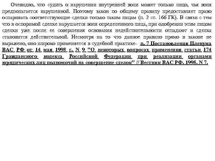 Очевидно, что судить о нарушении внутренней воли может только лицо, чья воля предполагается нарушенной. Поэтому закон по общему правилу предоставляет право оспаривать соответствующие сделки только таким лицам (п. 2 ст. 166 ГК). В связи с тем что в оспоримой сделке нарушается воля определенного лица, при одобрении этим лицом сделки уже после ее совершения основания недействительности отпадают и сделка становится действительной. Несмотря на то что данное правило прямо в законе не выражено, оно широко применяется в судебной практике- п. 7 Постановления Пленума ВАС РФ от 14 мая 1998 г. N 9 "О некоторых вопросах применения статьи 174 Гражданского кодекса Российской Федерации при реализации органами юридических лиц полномочий на совершение сделок" // Вестник ВАС РФ. 1998. N 7.