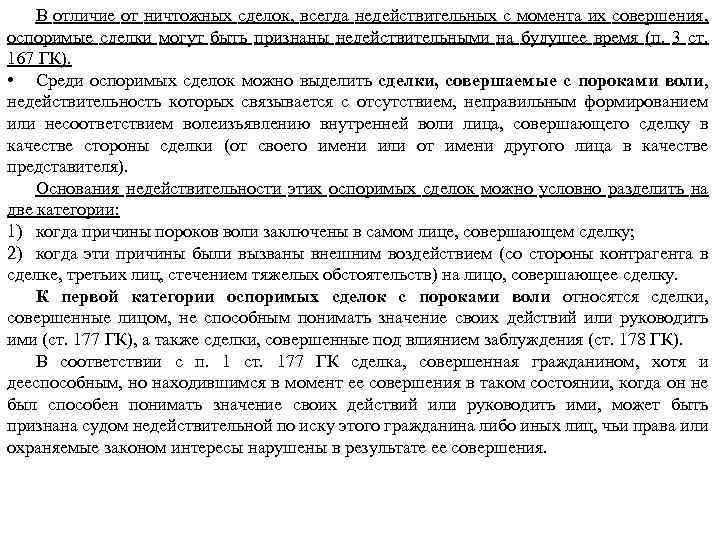 В отличие от ничтожных сделок, всегда недействительных с момента их совершения, оспоримые сделки могут быть признаны недействительными на будущее время (п. 3 ст. 167 ГК). • Среди оспоримых сделок можно выделить сделки, совершаемые с пороками воли, недействительность которых связывается с отсутствием, неправильным формированием или несоответствием волеизъявлению внутренней воли лица, совершающего сделку в качестве стороны сделки (от своего имени или от имени другого лица в качестве представителя). Основания недействительности этих оспоримых сделок можно условно разделить на две категории: 1) когда причины пороков воли заключены в самом лице, совершающем сделку; 2) когда эти причины были вызваны внешним воздействием (со стороны контрагента в сделке, третьих лиц, стечением тяжелых обстоятельств) на лицо, совершающее сделку. К первой категории оспоримых сделок с пороками воли относятся сделки, совершенные лицом, не способным понимать значение своих действий или руководить ими (ст. 177 ГК), а также сделки, совершенные под влиянием заблуждения (ст. 178 ГК). В соответствии с п. 1 ст. 177 ГК сделка, совершенная гражданином, хотя и дееспособным, но находившимся в момент ее совершения в таком состоянии, когда он не был способен понимать значение своих действий или руководить ими, может быть признана судом недействительной по иску этого гражданина либо иных лиц, чьи права или охраняемые законом интересы нарушены в результате ее совершения.