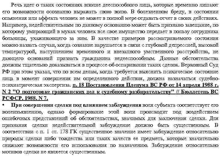 Речь идет о таких состояниях вполне дееспособного лица, которые временно лишают его возможности осознанно выражать свою волю. В болезненном бреду, в состоянии опьянения или аффекта человек не может в полной мере отдавать отчет в своих действиях. Например, недействительным по данному основанию может быть признано завещание, по которому умирающий в муках человек все свое имущество передает в пользу сотрудника больницы, ухаживающего за ним. В качестве примеров рассматриваемого состояния можно назвать случаи, когда сознание нарушается в связи с глубокой депрессией, высокой температурой, наступлением временного и внезапного умственного расстройства, не дающего оснований признать гражданина недееспособным. Данные обстоятельства должны тщательно доказываться в процессе об оспаривании таких сделок. Верховный Суд РФ при этом указал, что по всем делам, когда требуется выяснить психическое состояние лица в момент совершения им определенного действия, должна назначаться судебнопсихиатрическая экспертиза. п. 18 Постановления Пленума ВС РФ от 14 апреля 1988 г. N 2 "О подготовке гражданских дел к судебному разбирательству" // Бюллетень ВС РСФСР. 1988. N 7. • При совершении сделки под влиянием заблуждения воля субъекта соответствует его волеизъявлению, однако формирование этой воли происходит под воздействием ошибочных представлений об обстоятельствах, значимых для заключения сделки. Для признания сделки недействительной заблуждение должно быть существенным. В соответствии с п. 1 ст. 178 ГК существенное значение имеет заблуждение относительно природы сделки либо тождества или таких качеств ее предмета, которые значительно снижают возможности его использования по назначению. Заблуждение относительно мотивов сделки не является существенным.