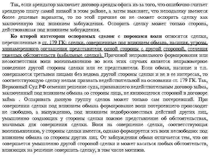 Так, если арендатор заключает договор аренды офиса из-за того, что ошибочно считает арендную плату самой низкой в этом районе, а затем выясняет, что неподалеку имеются более дешевые варианты, то по этой причине он не сможет оспорить сделку как заключенную под влиянием заблуждения. Оспорить сделку может только сторона, действовавшая под влиянием заблуждения. Ко второй категории оспоримых сделок с пороками воли относятся сделки, перечисленные в ст. 179 ГК: сделки, совершенные под влиянием обмана, насилия, угрозы, злонамеренного соглашения представителя одной стороны с другой стороной, стечения тяжелых обстоятельств (кабальные сделки). Причиной неправильного формирования или несоответствия воли волеизъявлению во всех этих случаях является неправомерное поведение другой стороны сделки или ее представителя. Если обман, насилие и т. п. совершаются третьими лицами без ведома другой стороны сделки и не в ее интересах, то соответствующую сделку нельзя признать недействительной на основании ст. 179 ГК. Так, Верховный Суд РФ отменил решение суда, признавшего недействительным договор займа, заключенный под влиянием обмана со стороны лица, не являющегося стороной в договоре займа . Оспаривать данную группу сделок может только сам потерпевший. При совершении сделки под влиянием обмана формирование воли потерпевшего происходит не свободно, а вынужденно, под влиянием недобросовестных действий других лиц, умышленно создающих у стороны сделки ложное представление об обстоятельствах, значимых для совершения сделки. Воля на совершение сделки, соответствующая волеизъявлению, у стороны сделки имеется, однако формируется эта воля несвободно: под влиянием обмана со стороны других лиц. От заблуждения обман отличается тем, что он совершается умышленно другой стороной сделки и может касаться любых обстоятельств, влияющих на решение совершить сделку, в том числе мотивов.