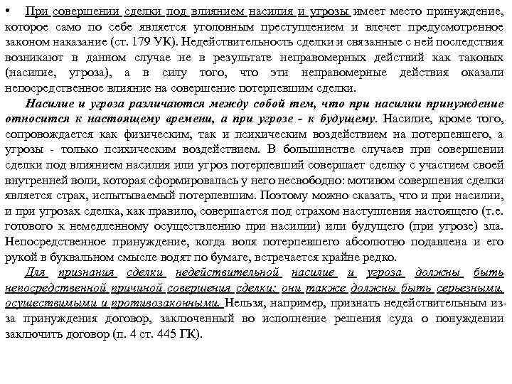 • При совершении сделки под влиянием насилия и угрозы имеет место принуждение, которое само по себе является уголовным преступлением и влечет предусмотренное законом наказание (ст. 179 УК). Недействительность сделки и связанные с ней последствия возникают в данном случае не в результате неправомерных действий как таковых (насилие, угроза), а в силу того, что эти неправомерные действия оказали непосредственное влияние на совершение потерпевшим сделки. Насилие и угроза различаются между собой тем, что при насилии принуждение относится к настоящему времени, а при угрозе - к будущему. Насилие, кроме того, сопровождается как физическим, так и психическим воздействием на потерпевшего, а угрозы - только психическим воздействием. В большинстве случаев при совершении сделки под влиянием насилия или угроз потерпевший совершает сделку с участием своей внутренней воли, которая сформировалась у него несвободно: мотивом совершения сделки является страх, испытываемый потерпевшим. Поэтому можно сказать, что и при насилии, и при угрозах сделка, как правило, совершается под страхом наступления настоящего (т. е. готового к немедленному осуществлению при насилии) или будущего (при угрозе) зла. Непосредственное принуждение, когда воля потерпевшего абсолютно подавлена и его рукой в буквальном смысле водят по бумаге, встречается крайне редко. Для признания сделки недействительной насилие и угроза должны быть непосредственной причиной совершения сделки; они также должны быть серьезными, осуществимыми и противозаконными. Нельзя, например, признать недействительным изза принуждения договор, заключенный во исполнение решения суда о понуждении заключить договор (п. 4 ст. 445 ГК).