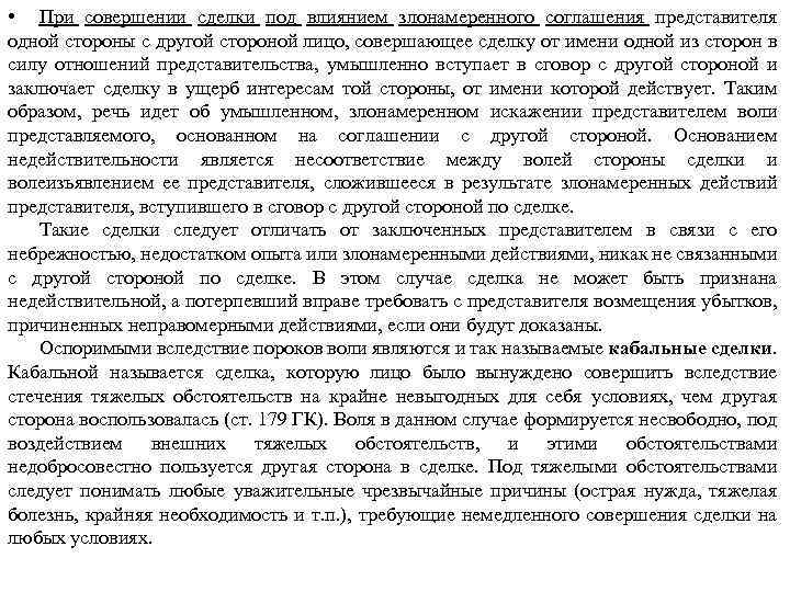• При совершении сделки под влиянием злонамеренного соглашения представителя одной стороны с другой стороной лицо, совершающее сделку от имени одной из сторон в силу отношений представительства, умышленно вступает в сговор с другой стороной и заключает сделку в ущерб интересам той стороны, от имени которой действует. Таким образом, речь идет об умышленном, злонамеренном искажении представителем воли представляемого, основанном на соглашении с другой стороной. Основанием недействительности является несоответствие между волей стороны сделки и волеизъявлением ее представителя, сложившееся в результате злонамеренных действий представителя, вступившего в сговор с другой стороной по сделке. Такие сделки следует отличать от заключенных представителем в связи с его небрежностью, недостатком опыта или злонамеренными действиями, никак не связанными с другой стороной по сделке. В этом случае сделка не может быть признана недействительной, а потерпевший вправе требовать с представителя возмещения убытков, причиненных неправомерными действиями, если они будут доказаны. Оспоримыми вследствие пороков воли являются и так называемые кабальные сделки. Кабальной называется сделка, которую лицо было вынуждено совершить вследствие стечения тяжелых обстоятельств на крайне невыгодных для себя условиях, чем другая сторона воспользовалась (ст. 179 ГК). Воля в данном случае формируется несвободно, под воздействием внешних тяжелых обстоятельств, и этими обстоятельствами недобросовестно пользуется другая сторона в сделке. Под тяжелыми обстоятельствами следует понимать любые уважительные чрезвычайные причины (острая нужда, тяжелая болезнь, крайняя необходимость и т. п. ), требующие немедленного совершения сделки на любых условиях.