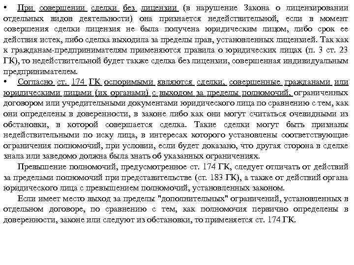 • При совершении сделки без лицензии (в нарушение Закона о лицензировании отдельных видов деятельности) она признается недействительной, если в момент совершения сделки лицензия не была получена юридическим лицом, либо срок ее действия истек, либо сделка выходила за пределы прав, установленных лицензией. Так к гражданам-предпринимателям применяются правила о юридических лицах (п. 3 ст. 23 ГК), то недействительной будет также сделка без лицензии, совершенная индивидуальным предпринимателем. • Согласно ст. 174 ГК оспоримыми являются сделки, совершенные гражданами или юридическими лицами (их органами) с выходом за пределы полномочий, ограниченных договором или учредительными документами юридического лица по сравнению с тем, как они определены в доверенности, в законе либо как они могут считаться очевидными из обстановки, в которой совершается сделка. Такие сделки могут быть признаны недействительными по иску лица, в интересах которого установлены соответствующие ограничения полномочий, при условии, если будет доказано, что другая сторона в сделке знала или заведомо должна была знать об указанных ограничениях. Превышение полномочий, предусмотренное ст. 174 ГК, следует отличать от действий за пределами полномочий при представительстве (ст. 183 ГК), а также от действий органа юридического лица с превышением полномочий, установленных законом. Если имеет место выход за пределы "дополнительных" ограничений, установленных в отдельном договоре, по сравнению с тем, как полномочия первично определены в доверенности, законе или следуют из обстановки, то применяется ст. 174 ГК.
