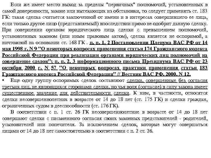 Если же имеет место выход за пределы "первичных" полномочий, установленных в самой доверенности, законе или вытекающих из обстановки, то следует применять ст. 183 ГК: такая сделка считается заключенной от имени и в интересах совершившего ее лица, если только другое лицо (представляемый) впоследствии прямо не одобрит данную сделку. При совершении органом юридического лица сделки с превышением полномочий, установленных законом (или иным правовым актом), сделка является не оспоримой, а ничтожной на основании ст. 168 ГК. п. п. 1, 2 Постановления Пленума ВАС РФ от 14 мая 1998 г. N 9 "О некоторых вопросах применения статьи 174 Гражданского кодекса Российской Федерации при реализации органами юридических лиц полномочий на совершение сделок"; п. п. 2, 3 информационного письма Президиума ВАС РФ от 23 октября 2000 г. N 57 "О некоторых вопросах практики применения статьи 183 Гражданского кодекса Российской Федерации" // Вестник ВАС РФ. 2000. N 12. • Еще одну группу оспоримых сделок составляют сделки, совершенные без согласия третьих лиц, не являющихся сторонами сделки, но чья воля (согласие) в силу закона имеет существенное значение для действительности сделки. К ним, в частности, относятся сделки несовершеннолетних в возрасте от 14 до 18 лет (ст. 175 ГК) и сделки граждан, ограниченных судом в дееспособности (ст. 176 ГК). В соответствии с п. 1 ст. 26 ГК несовершеннолетние в возрасте от 14 до 18 лет совершают сделки с письменного согласия своих законных представителей - родителей, усыновителей или попечителя. За исключением сделок, которые могут совершаться лицами от 14 до 18 лет самостоятельно в соответствии с п. 2 ст. 26.