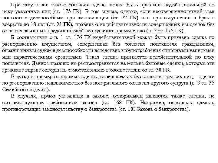 При отсутствии такого согласия сделка может быть признана недействительной по иску указанных лиц (ст. 175 ГК). В том случае, однако, если несовершеннолетний стал полностью дееспособным при эмансипации (ст. 27 ГК) или при вступлении в брак в возрасте до 18 лет (ст. 21 ГК), правила о недействительности совершенных им сделок без согласия законных представителей не подлежат применению (п. 2 ст. 175 ГК). В соответствии с п. 1 ст. 176 ГК недействительной может быть признана сделка по распоряжению имуществом, совершенная без согласия попечителя гражданином, ограниченным судом в дееспособности вследствие злоупотребления спиртными напитками или наркотическими средствами. Такая сделка признается недействительной по иску попечителя. Данное правило не распространяется на мелкие бытовые сделки, которые эти граждане вправе совершать самостоятельно в соответствии со ст. 30 ГК. Еще один пример оспоримых сделок, совершаемых без согласия третьих лиц, - сделки по распоряжению недвижимостью без нотариального согласия другого супруга (п. 3 ст. 35 Семейного кодекса). В случаях, прямо указанных в законе, оспоримыми являются также сделки, не соответствующие требованиям закона (ст. 168 ГК). Например, оспоримы сделки, противоречащие законодательству о банкротстве (ст. 103 Закона о банкротстве).