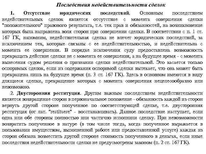 Последствия недействительности сделок 1. Отсутствие юридических последствий. Основным последствием недействительных сделок является отсутствие с момента совершения сделки "положительного" правового результата, т. е. тех прав и обязанностей, на возникновение которых была направлена воля сторон при совершении сделки. В соответствии с п. 1 ст. 167 ГК, напомним, недействительная сделка не влечет юридических последствий, за исключением тех, которые связаны с ее недействительностью, и недействительна с момента ее совершения. В порядке исключения суду предоставлена возможность прекращать действие сделки не с момента ее совершения, а на будущее время - с момента вынесения судом решения о признании сделки недействительной. Это касается только оспоримых сделок, если из содержания оспоримой сделки вытекает, что она может быть прекращена лишь на будущее время (п. 3 ст. 167 ГК). Здесь в основном имеются в виду длящиеся сделки, прекращение которых с момента совершения нецелесообразно или невозможно. 2. Двусторонняя реституция. Другим важным последствием недействительности является возвращение сторон в первоначальное положение - обязанность каждой из сторон вернуть другой стороне полученное по соответствующей сделке, т. е. двусторонняя реституция (от лат. "restituere" - восстанавливать). Данное последствие наступает, если одна или обе стороны полностью или частично исполнили сделку. При невозможности возвратить полученное в натуре (в том числе тогда, когда полученное выражается в пользовании имуществом, выполненной работе или предоставленной услуге) каждая из сторон обязана возместить другой стороне стоимость полученного в деньгах, если иные последствия недействительности сделки не предусмотрены законом (п. 2 ст. 167 ГК).
