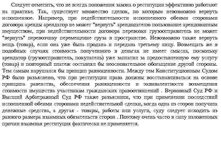 Следует отметить, что не всегда положения закона о реституции эффективно работают на практике. Так, существует множество сделок, по которым невозможно вернуть исполненное. Например, при недействительности исполненного обеими сторонами договора аренды арендатор не может "вернуть" арендодателю пользование арендованным имуществом, при недействительности договора перевозки грузоотправитель не может "вернуть" перевозчику перемещение груза в пространстве. Невозможно также вернуть вещь (товар), если она уже была продана и передана третьему лицу. Возмещать же в подобных случаях стоимость полученного в деньгах не имеет смысла, поскольку арендатор (грузоотправитель, покупатель) уже заплатил за предоставленную ему услугу (товар) и повторный платеж составлял бы неосновательное обогащение другой стороны. Тем самым нарушался бы принцип равноценности. Между тем Конституционным Судом РФ было разъяснено, что при реституции права должны восстанавливаться на основе принципа равенства, обеспечения равноценности и эквивалентности возмещения стоимости имущества участникам гражданских правоотношений . Верховный Суд РФ и Высший Арбитражный Суд РФ также разъяснили, что применении последствий исполненной обеими сторонами недействительной сделки, когда одна из сторон получила денежные средства, а другая - товары, работы или услуги, суду следует исходить из равного размера взаимных обязательств сторон. Поэтому очень часто в силу изложенных причин взаимная реституция фактически не применяется.