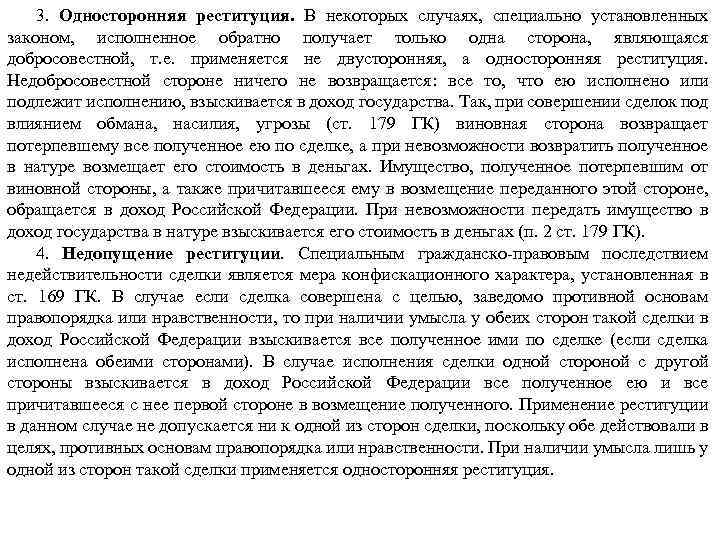 3. Односторонняя реституция. В некоторых случаях, специально установленных законом, исполненное обратно получает только одна сторона, являющаяся добросовестной, т. е. применяется не двусторонняя, а односторонняя реституция. Недобросовестной стороне ничего не возвращается: все то, что ею исполнено или подлежит исполнению, взыскивается в доход государства. Так, при совершении сделок под влиянием обмана, насилия, угрозы (ст. 179 ГК) виновная сторона возвращает потерпевшему все полученное ею по сделке, а при невозможности возвратить полученное в натуре возмещает его стоимость в деньгах. Имущество, полученное потерпевшим от виновной стороны, а также причитавшееся ему в возмещение переданного этой стороне, обращается в доход Российской Федерации. При невозможности передать имущество в доход государства в натуре взыскивается его стоимость в деньгах (п. 2 ст. 179 ГК). 4. Недопущение реституции. Специальным гражданско-правовым последствием недействительности сделки является мера конфискационного характера, установленная в ст. 169 ГК. В случае если сделка совершена с целью, заведомо противной основам правопорядка или нравственности, то при наличии умысла у обеих сторон такой сделки в доход Российской Федерации взыскивается все полученное ими по сделке (если сделка исполнена обеими сторонами). В случае исполнения сделки одной стороной с другой стороны взыскивается в доход Российской Федерации все полученное ею и все причитавшееся с нее первой стороне в возмещение полученного. Применение реституции в данном случае не допускается ни к одной из сторон сделки, поскольку обе действовали в целях, противных основам правопорядка или нравственности. При наличии умысла лишь у одной из сторон такой сделки применяется односторонняя реституция.