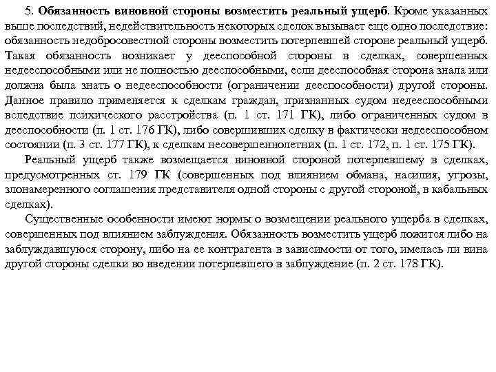 5. Обязанность виновной стороны возместить реальный ущерб. Кроме указанных выше последствий, недействительность некоторых сделок вызывает еще одно последствие: обязанность недобросовестной стороны возместить потерпевшей стороне реальный ущерб. Такая обязанность возникает у дееспособной стороны в сделках, совершенных недееспособными или не полностью дееспособными, если дееспособная сторона знала или должна была знать о недееспособности (ограничении дееспособности) другой стороны. Данное правило применяется к сделкам граждан, признанных судом недееспособными вследствие психического расстройства (п. 1 ст. 171 ГК), либо ограниченных судом в дееспособности (п. 1 ст. 176 ГК), либо совершивших сделку в фактически недееспособном состоянии (п. 3 ст. 177 ГК), к сделкам несовершеннолетних (п. 1 ст. 172, п. 1 ст. 175 ГК). Реальный ущерб также возмещается виновной стороной потерпевшему в сделках, предусмотренных ст. 179 ГК (совершенных под влиянием обмана, насилия, угрозы, злонамеренного соглашения представителя одной стороны с другой стороной, в кабальных сделках). Существенные особенности имеют нормы о возмещении реального ущерба в сделках, совершенных под влиянием заблуждения. Обязанность возместить ущерб ложится либо на заблуждавшуюся сторону, либо на ее контрагента в зависимости от того, имелась ли вина другой стороны сделки во введении потерпевшего в заблуждение (п. 2 ст. 178 ГК).