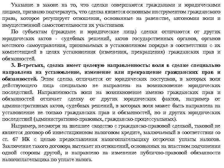 Указание в законе на то, что сделки совершаются гражданами и юридическими лицами, призвано подчеркнуть, что сделка является основным инструментом гражданского права, которое регулирует отношения, основанные на равенстве, автономии воли и имущественной самостоятельности их участников. По субъектам (граждане и юридические лица) сделки отличаются от других юридических актов - судебных решений, актов государственных органов, органов местного самоуправления, принимаемых в установленном порядке в соответствии с их компетенцией в целях установления (изменения, прекращения) гражданских прав и обязанностей. 3. В-третьих, сделка имеет целевую направленность: воля в сделке специально направлена на установление, изменение или прекращение гражданских прав и обязанностей. Этим сделка отличается от юридических поступков, в которых воля действующего лица специально не направлена на возникновение юридических последствий. Направленность воли на возникновение именно гражданских прав и обязанностей отличает сделку от других юридических фактов, например от административных актов, судебных решений, в которых воля может быть направлена на установление не только гражданских прав и обязанностей, но и других юридических последствий (административно-правовых, гражданско-процессуальных). Например, несмотря на внешнее сходство с гражданско-правовой сделкой, таковой не является договор об инвестиционном налоговом кредите, заключаемый в соответствии со ст. 67 НК с целью предоставления налогоплательщику отсрочки уплаты налогов. Заключение такого договора вытекает из отношений, основанных на властном подчинении одной стороны другой, и направлено на изменение публично-правовой обязанности налогоплательщика по уплате налога.