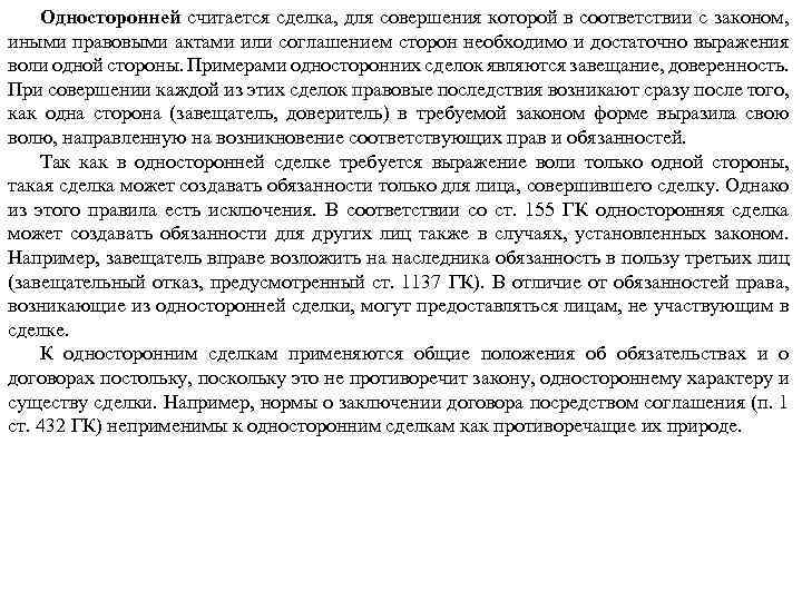 Односторонней считается сделка, для совершения которой в соответствии с законом, иными правовыми актами или соглашением сторон необходимо и достаточно выражения воли одной стороны. Примерами односторонних сделок являются завещание, доверенность. При совершении каждой из этих сделок правовые последствия возникают сразу после того, как одна сторона (завещатель, доверитель) в требуемой законом форме выразила свою волю, направленную на возникновение соответствующих прав и обязанностей. Так как в односторонней сделке требуется выражение воли только одной стороны, такая сделка может создавать обязанности только для лица, совершившего сделку. Однако из этого правила есть исключения. В соответствии со ст. 155 ГК односторонняя сделка может создавать обязанности для других лиц также в случаях, установленных законом. Например, завещатель вправе возложить на наследника обязанность в пользу третьих лиц (завещательный отказ, предусмотренный ст. 1137 ГК). В отличие от обязанностей права, возникающие из односторонней сделки, могут предоставляться лицам, не участвующим в сделке. К односторонним сделкам применяются общие положения об обязательствах и о договорах постольку, поскольку это не противоречит закону, одностороннему характеру и существу сделки. Например, нормы о заключении договора посредством соглашения (п. 1 ст. 432 ГК) неприменимы к односторонним сделкам как противоречащие их природе.
